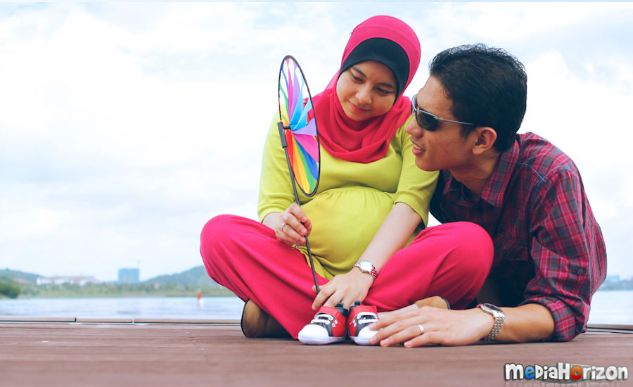 Sebelum bermulanya sesi outdoor ni, saya dah berbincang dengan pasangan untuk memilih tone warna baju yang sesuai. Kombinasi warna pasangan haruslah nampak sedondon untuk hasilkan mood. Anis sendiri memilih baju warna hijau muda bersama tudung pink bagi menimbulkan warna ceria. Sayapun galakkan warna-warna ceria untuk sesi outdoor sebab nak bagi nampak happy dan seolah-olah tak sabar nak tunggu kelahiran.