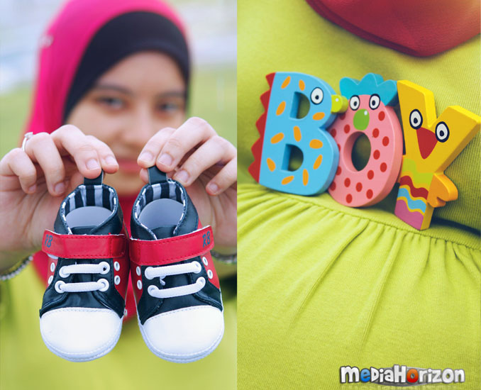 Pada awalnya sesi bergambar ni santai-santai saja dan saya bagi kebebasan kepada Anis dan Jojo untuk bergambar dengan pose masing-masing. Orang pregnantkan tak boleh berdiri lama sangat atau buat pose-pose yang extreme. Jadi saya banyak amik pose duduk dan sekali sekala berdiri. Macam mana sekalipun pose standard maternity macam buat bentuk love kat perut tu memang wajib diambil. Props macam kasut dan huruf “BOY” pun kadang kadang saya guna untuk hasilkan kelainan.