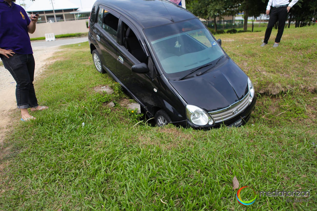 Selamat Tahun Baru 2014. Sedang baru saja menyambut hari pertama dalam tahun 2014 ini saya sekadar nak berkongsi dengan satu situasi yang telah berlaku di Pullman Putrajaya. Situasinya di mana sebuah kereta yang dipandu oleh seorang wanita termasuk ke dalam longkang besar ketika ingin memasuki kawasan parking berrumput. Benda ni sebenarnya mungkin berlaku kerana pemandu menganggap takde longkang dan terus memandu ke arah dalam longkang.