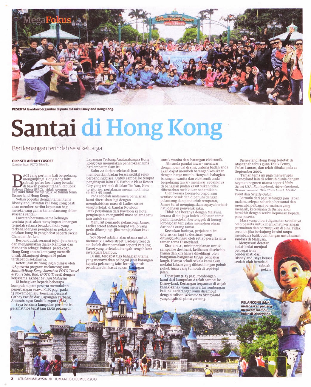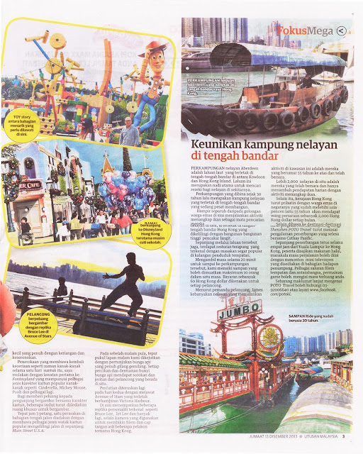 Mesti ramai yang ingat tentang percutian saya dan Zarith ke Disneyland Hong Kong pada hujung tahun lepas. Seperti yang saya maklumkan sebelum ini, pakej percutian yang saya dah ambil tu adalah pakej dari Poto Travel bersama Utusan Malaysia. Jadi cerita mengenai percutian tempoh hari tu telahpun ditulis dan dikeluarkan ke dalam Utusan Malaysia sisipan Mega. Jadi dipendekkan cerita adalah muka saya dan Zarith bersama ahli kumpulan A. Bangga juga la nak cakap muka keluar paper ni~!