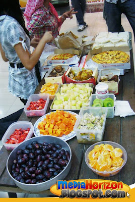 Antara menu makanan yang dibeli dari Tesco sebelah termasuklah Pizza, KFC, satay, sandwich, buah-buahan dan macam-macam lagi. Walaupun berkonsep ringkas dan santai tetapi sesi portluck pada hari tersebut amatlah bermakna. Mengunakan ruang lobby Les’ Copaque sebagai tempat makan masing-masing terus mengubah suasana kepada ala-ala picnic. Masing-masing juga turut mempromosikan makanan yang dibawa agar cepat laku.