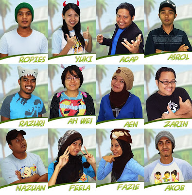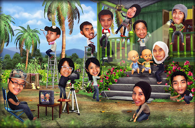 Yang menariknya, ialah gambar design ala-ala karikatur neh. Kami semua seolah-olah didesign sedang menyiapkan salah satu scene di dalam siri Upin & Ipin. Kalau nak ikutkan di dalam dunia sebenarnya kerja rendering team ni memanglah macam ni. Makeup artis, lightingman, cameraman, propsman dan segala-gala jenis man lah. Tapi semua tu kita hasilkan di dalam komputer. Menarikkan?